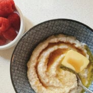 You could go bonkers with it (cinnamon, nuts, chocolate chips, peanut butter, honey, blueberry sauce, etc.) but how I really love it is just plain and simple – a small steaming bowl with a drizzle of maple syrup, a melty knob of good butter, and a few juicy raspberries on top.