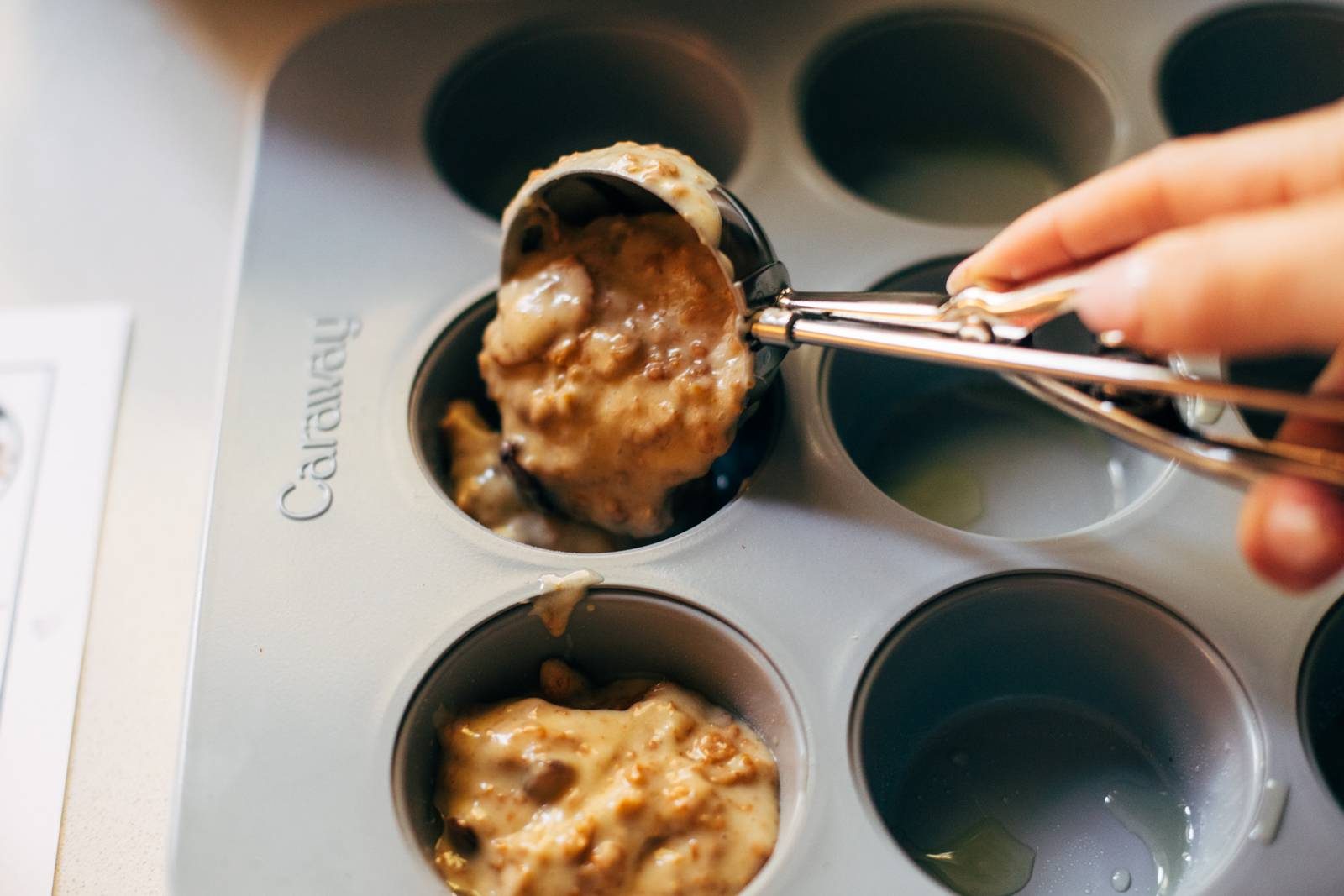 Portion out the batter into a well-oiled muffin tin. The batter should fill one full muffin tin (12 muffins).