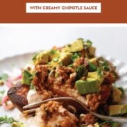Roasted sweet potatoes topped with creamy chipotle sauce, spicy ground chicken, avocado, cilantro, and pickled onion. My family loves them!