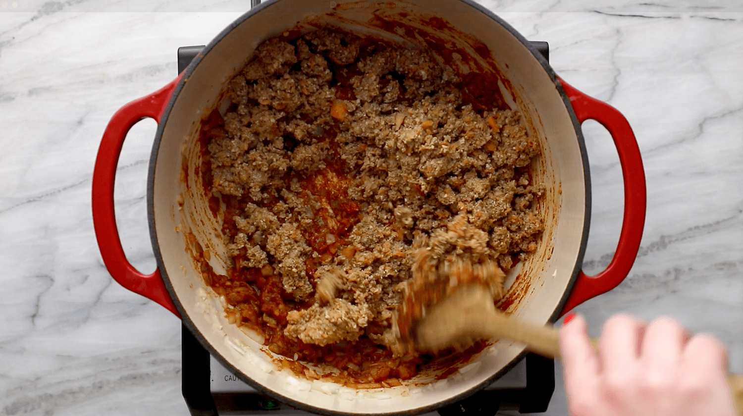 4. Add your “meat” to the pan – once it mixes in and starts cooking, it should start to resemble chili meat. Let the “meat” cook for 10 minutes or so to soften the vegetables. Season with salt.